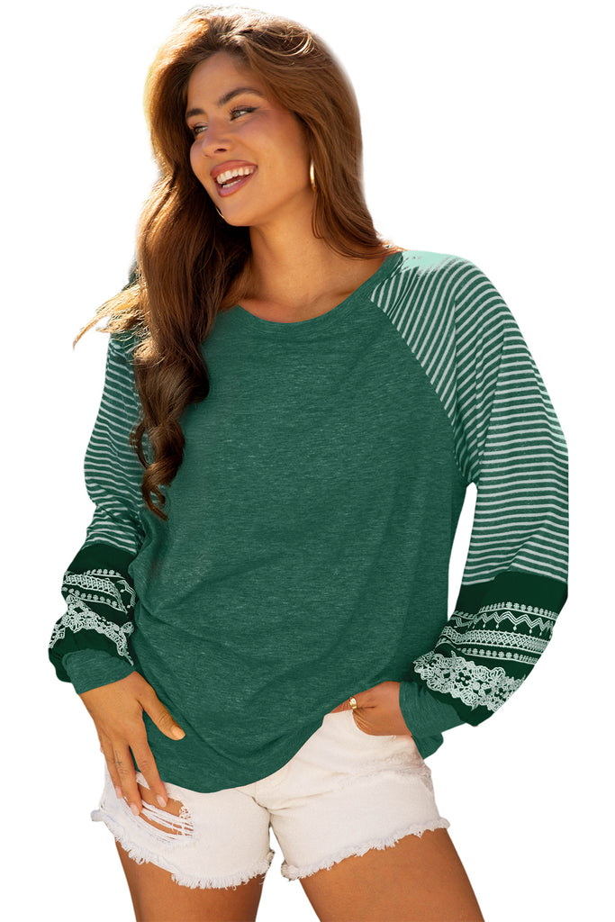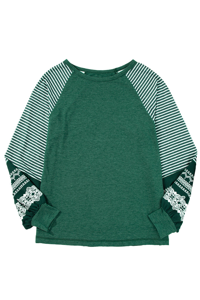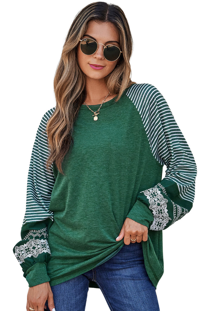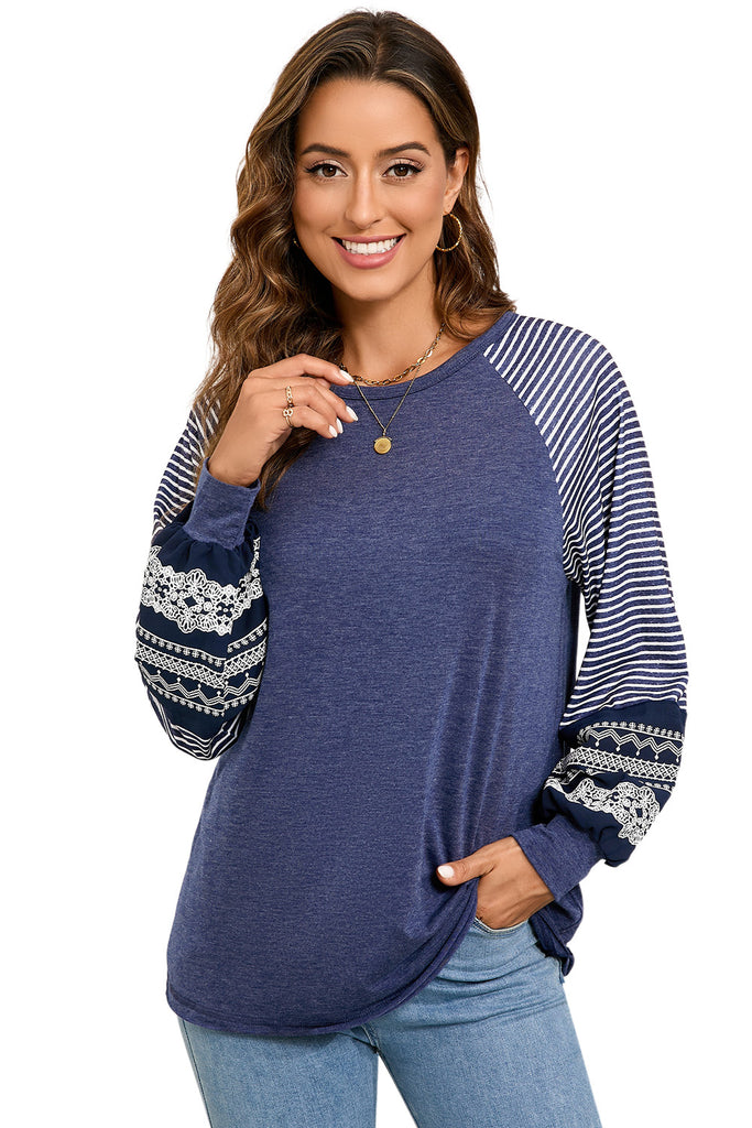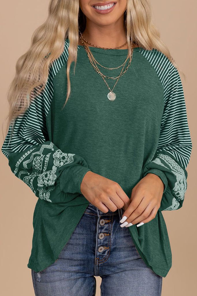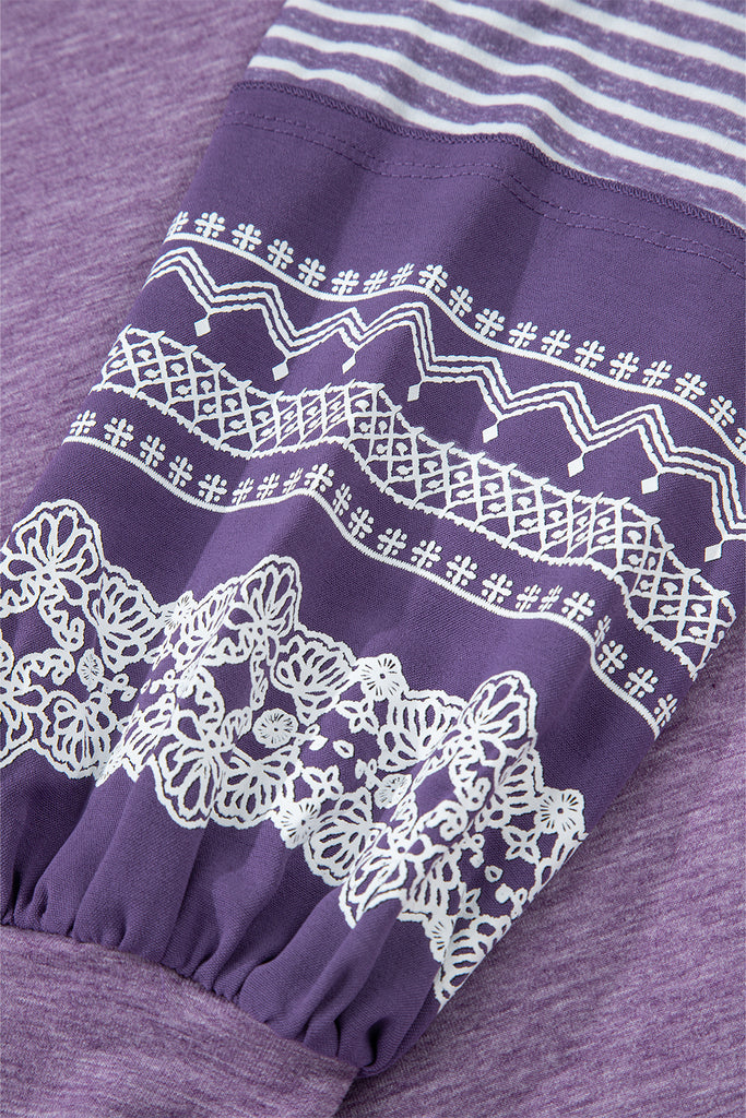 Tillandsia Purple Contrast Print Striped Raglan Long Sleeve Loose Top